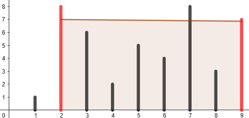 先輩有$n$個杯壁高度,它們分別照順序擺放在x軸上,但是一個杯子的組成只有兩個杯壁與一個杯底,因此你需要幫忙先輩挑出能裝最多紅茶的兩個杯壁。舉例,今天有[1,8,6,2,5,4,8,3,7]的杯壁高度,挑選第二項的8與最後一項的7能裝到49的紅茶,也就是最多的紅茶。